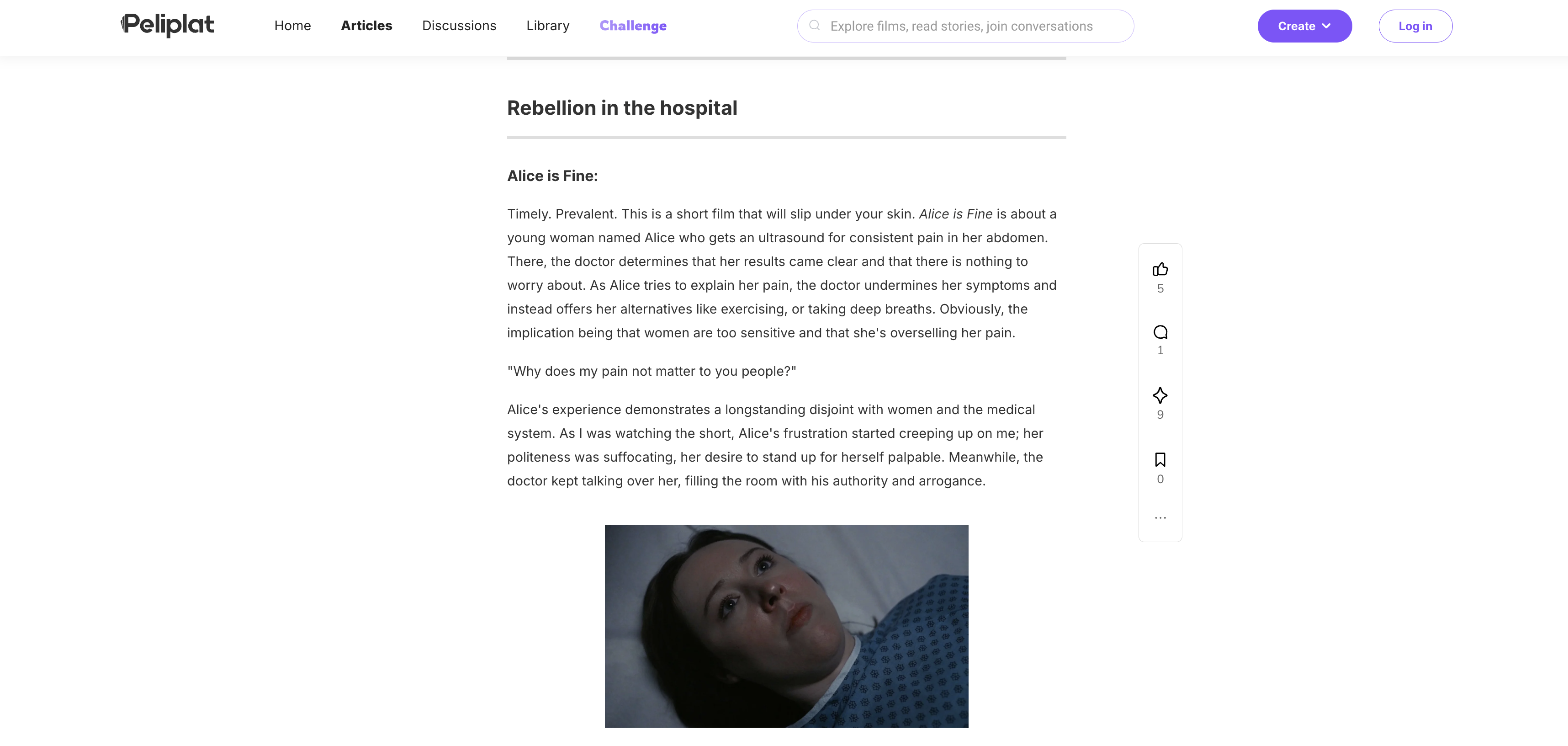 "Timely. Prevalent. This is a short film that will slip under your skin. [...] As a woman, I felt myself being swept up by Alice's story. The film did an incredible job of building tension, using comedy and cinematography in a way that felt both natural and evocative."